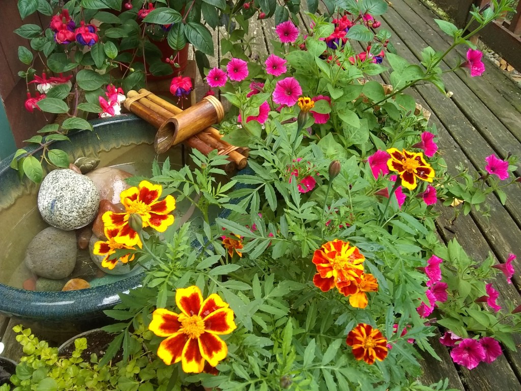 Two days after Labor Day, big yellow maple leaves are drifting to the ground. Apples on the gnarled tree by the clubhouse are blushing red. My deck garden is at its blooming peak.