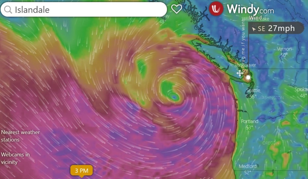 Today, the Windy map shows a huge, scary spiral of counterclockwise winds off the Washington coast, centered 280 miles offshore and whirling toward British Columbia. Much of it is bypassing Seattle, but the San Juan Islands are picking up more of the storm’s fringes. As I write, we have steady winds of 25 to 30 mph out of the southeast, drawn by the offshore maelstrom.