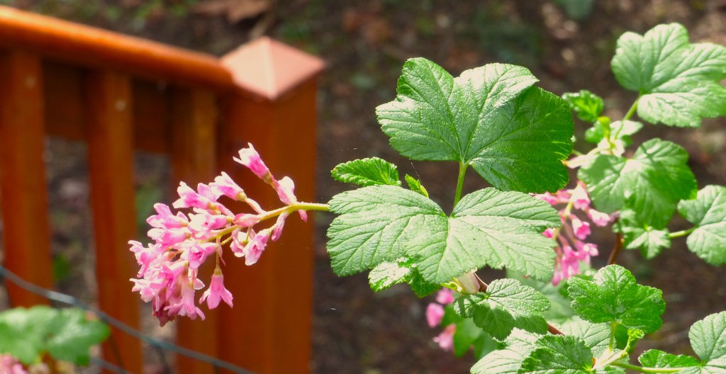 Hummingbirds loved the flowers, and I mounted a bird feeder on the rail there so eager nuthatches, finches, juncos and towhees could use the currant’s branches as a perch while waiting their turn for a sunflower seed. It was akin to the queuing area at airport security. Always busy. And when fruit emerged later in the season, something of an avian snack bar.