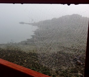 Foggy dew beads up on a spider web on the Center Island dock railing.