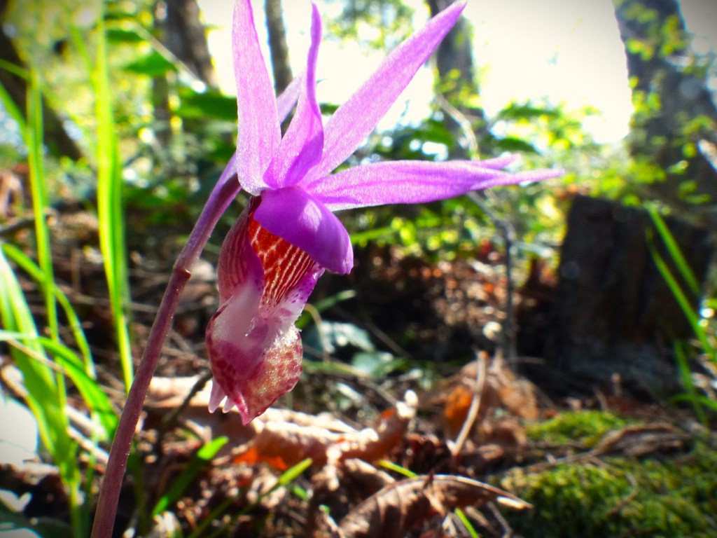 Magnified with a close-up lens, a tiny Calypso orchid, or Fairy Slipper, blooms on the hillside behind Nuthatch Cabin.