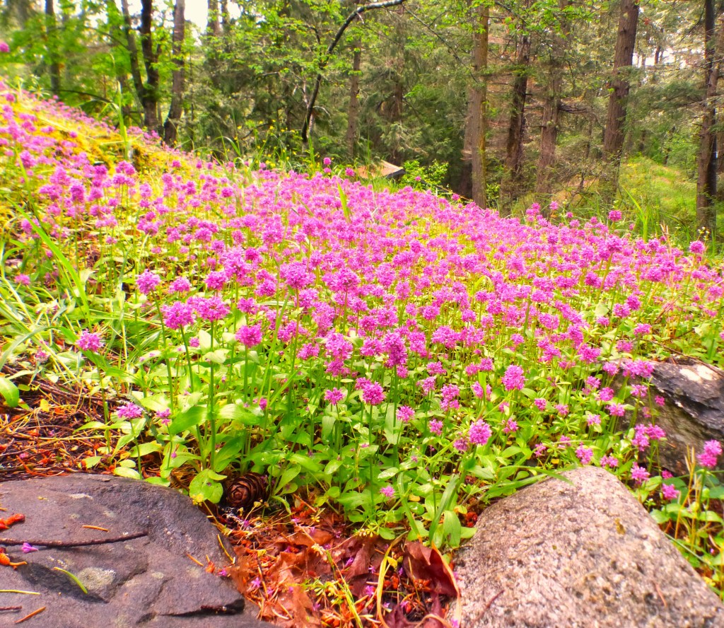 I love to visit such places. Yet I’m always happy to come home to Center Island. While I was away, the wildflowers bloomed. My rocky knoll is awash with a pleasing pink wave of sea blush. Buttercups and the first spiky flowers of blue camas add to the splendid scene.