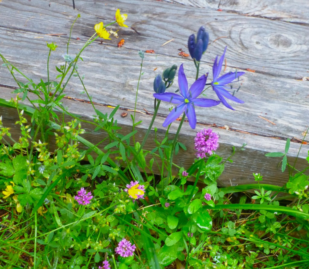 Blue camas mingles with other wildflowers by the front step of my writing hut. The starry flower’s bulbs were once a staple in the diet of Northwest tribes, who steamed them like potatoes. Don’t confuse the bulbs with those of the aptly named (and toxic) death camas, which has a spiky cluster of white inflorescence. The two types of camas often grow in close proximity.