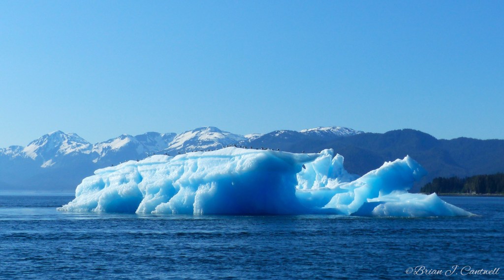 Birds line the top of an iceberg in Holkam Bay at the entrance to Alaska’s Tracy Arm fjord, where bergs calve off of two glaciers.