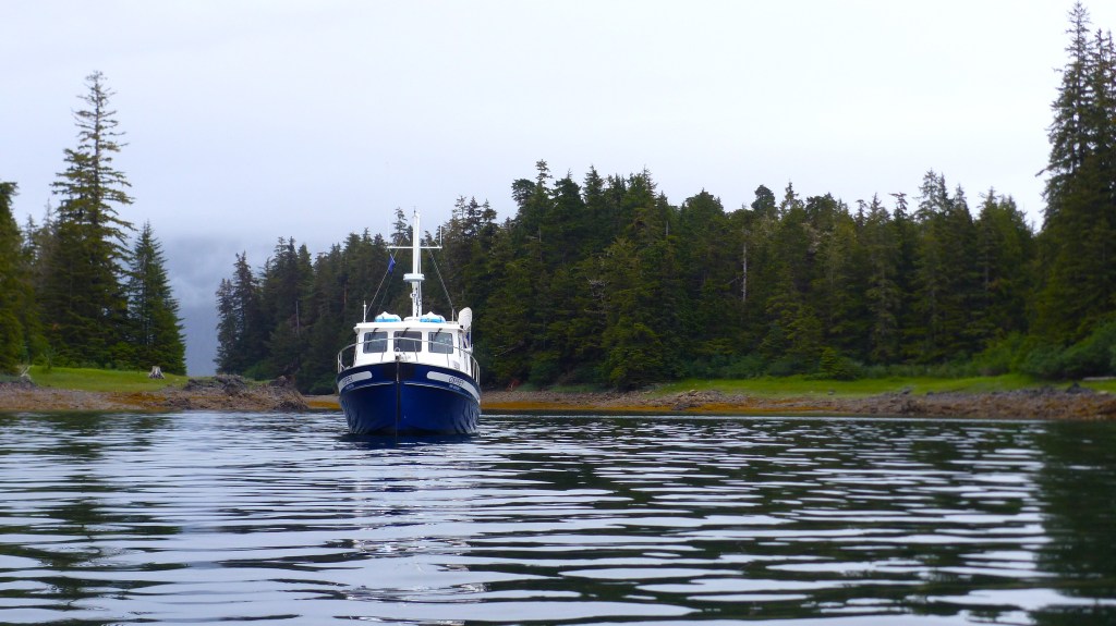 (1) Another blessed travel day, with 57 miles under the keel, in placid waters. Misty and drizzly much of the way but with wide, wide Alaska panoramas visible beneath the low cloud ceiling – snowy mountains on the horizon to port, little islets here and there, huge intersections of marine channels creating miles-wide expanses of green-gray saltwater where currents and waves could potentially crash like L.A. commuters when a traffic signal fails. But not on this quiet day. At Pybus Bay we found a Grand Banks anchored in Sheldon Cove, the one-boat cozy spot we had set as our destination. We considered arming the photon torpedoes and taking them out, but instead we moved to a just-as-cozy corner of nearby Cannery Cove where we were secure and happy. Outside the cove, a humpback entertained us for a half hour with spoutings and a tail display, and Dana, our new crew member, went crazy with her camera.