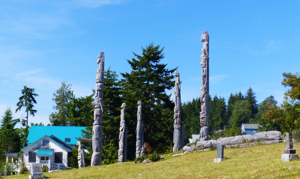 The `Namgis Burial Ground at Alert Bay, British Columbia, is an amalgam of old and new ways. Totem poles are erected in a person’s memory, along with “modern” headstones. By tradition, the totem poles are allowed to decay and fall, as seen at right.