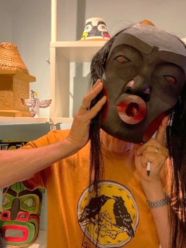 At U’mista Cultural Centre, you may try on replica masks, such as the Dzanakwa mask your correspondent models here. Naughty children, beware. Barbara Marrett photo.