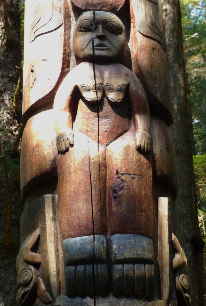Here, we marveled at scores of well-preserved, original masks, robes and hats, not just replicas. Many were colored with dyes made from nature: blackberry purples, elderberry reds, moss greens. These originals touched me in a way the replicas couldn’t match. Among my favorites: mallard hats, with duck heads on long necks poking from the front; the big-nosed Fool Dancer mask, whose wearer enforced the strict rules of the potlatch, using his club or axe (!) to bean misbehavers, while pretending to smear them with mucus from the big nose “about which he is very self-conscious” (according to the curator’s notes); and the aforementioned Dzanakwa. Curator notes told “how to spot a Dzanakwa in art”: a dark, hairy body, sunken eyes (often sleepy), puckered lips, large hands and pendulous breasts. How to spot her in real life: “Very stinky, you will smell her before you see her.” In all of these creations, not only did the indigenous people exhibit splendid artistry and craftsmanship, their imagination and humor was delightful. (Sorry I can’t share images of the original works; photography was prohibited in that part of the museum.)