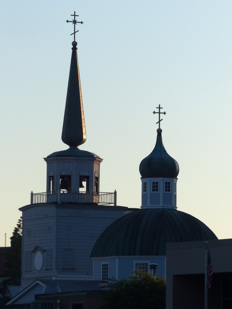 Sunset silhouettes the distinctive spires of St. Michael’s Russian Orthodox Cathedral in downtown Sitka.