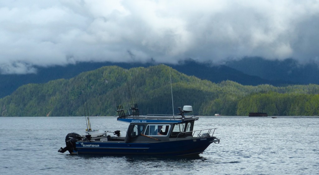 We didn’t expect to be in Port McNeill, on North Vancouver Island, for a couple more days, but the charming computerized voice on the weather radio (female, if you’ll forgive the gender profiling) told us of nasty winds coming. So our planned extended stay in Pruth Bay ended up as one night. Yesterday, we made a long day of it and transited Queen Charlotte Sound while the getting was good, and decided to push on here to wait out the 35-knot winds in the forecast.