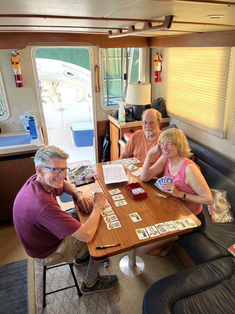 Game time aboard Osprey with your scribe, at left, and Bill Watson and Barbara Marrett. Dana Halferty photo