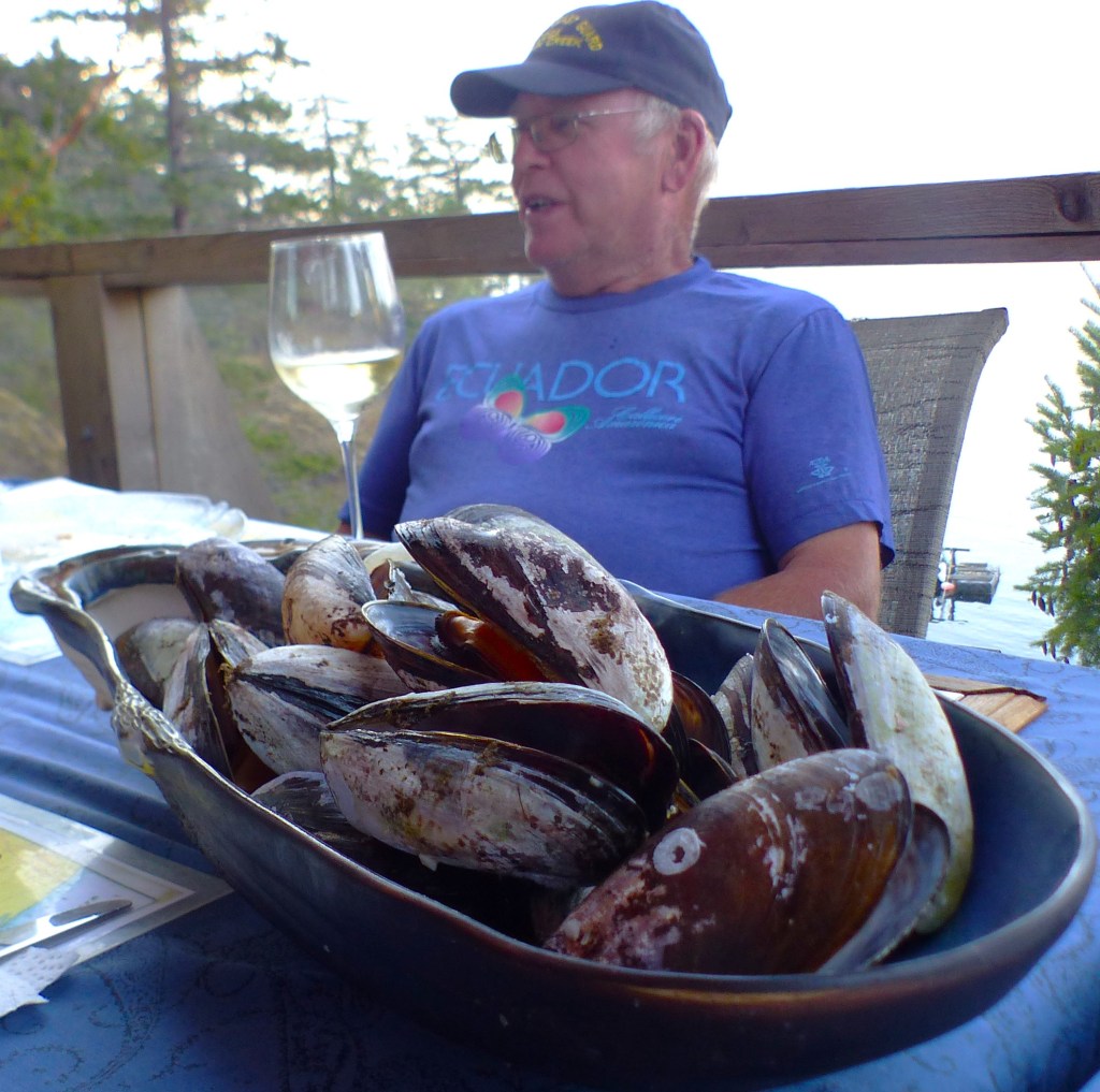 Gordon Jones and a bowl of enormous Honey Mussels from his cove on Lasqueti Island, B.C.