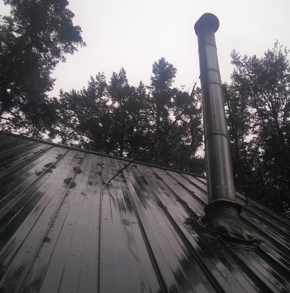 At that time, try as I might I couldn’t figure out how to open up the chimney and release the creature, which had fallen into the lowest reaches of the woodstove’s metal flue, the eight feet or so that connect the stove with the cabin ceiling. The chimney has a conical cap up top and I expect it was screened when it was new, but the screen has probably disintegrated with rust and heat over the years. Rising high above my rooftop, it’s not easily inspected.