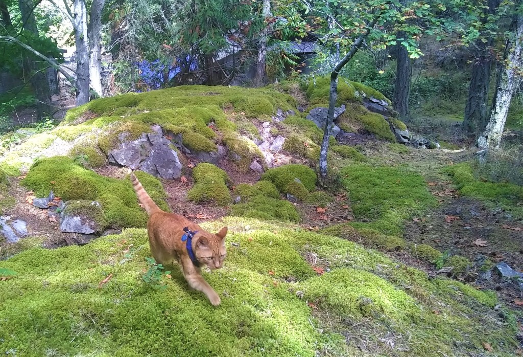 My custom is to bring a lunch up with me, along with a Thermos of hot water. A tiny table holds a variety of teas and instant coffee. As I write, I usually listen to my favorite music-streaming channel. Jackson Browne, Cat Stevens, Bill Withers and other mellow rockers of the 1970s ring out from the nice Polk Audio computer speakers I got for free at the Lopez Island Dump’s Take It-or-Leave-It warehouse. When the weather doesn’t keep her curled up in the cabin, Galley Cat is a regular visitor as I work. I slide open the door whenever I hear her scratch, and she leaps up on to a bookshelf to be rewarded with cat treats. On a warm day, she’ll be in and out every five minutes. (She shirks duties as a mouser, however. I must set traps on occasion.)